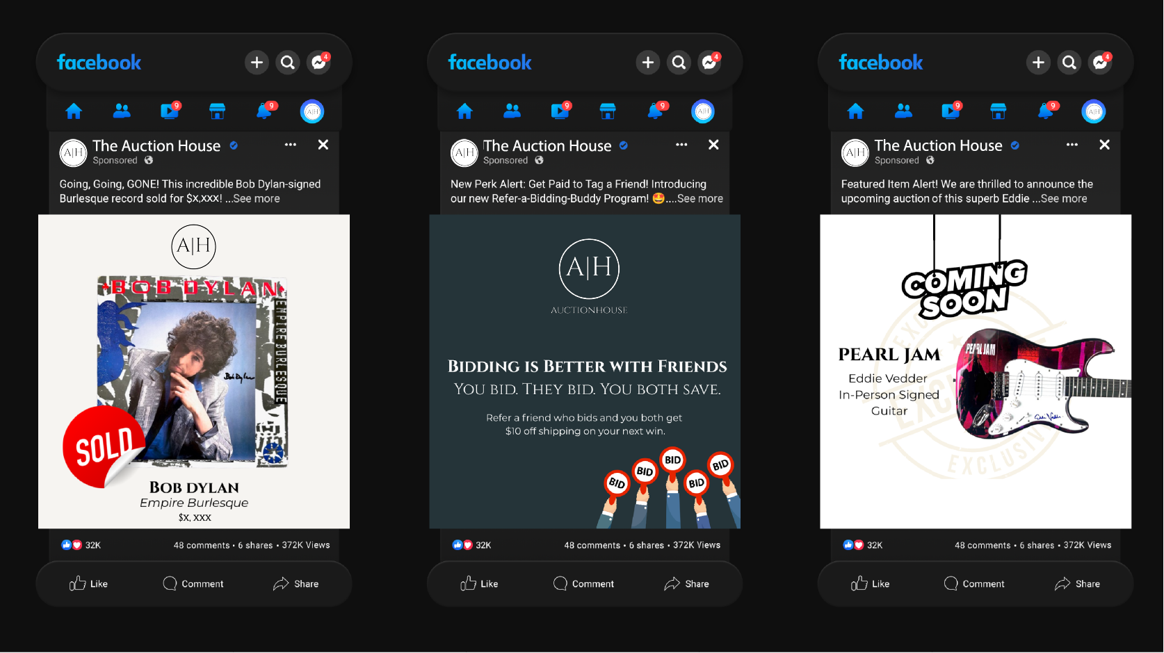 As an in-house designer at a New Hampshire–based online auction house specializing in music memorabilia, I created a range of social media content to promote their monthly auctions and strengthen audience engagement. The work spanned Instagram, Facebook, and TikTok, with designs tailored to each platform while maintaining brand consistency.